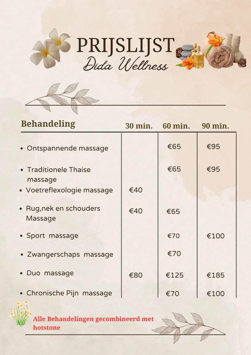 De meeste massages duren 30, 60 of 90 minuten. Bij het boeken zie je precies welke opties beschikbaar zijn en wat het beste bij jouw situatie past.